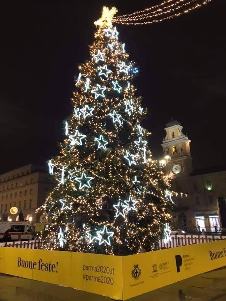 Si accende l’albero di Natale in piazza Garibaldi. Pizzarotti: “Che il 2021 sia l’anno della rinascita”