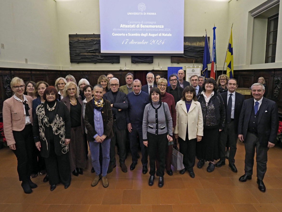 L’Aula Magna dell’Università di Parma ha ospitato ieri pomeriggio la tradizionale cerimonia di consegna degli attestati di benemerenza alla memoria e al personale andato in pensione nel 2024. Un’occasione, per l’Ateneo, per dire “grazie” per il servizio prestato a chi ha lasciato il lavoro in Unipr nel corso di quest’anno e anche all’intera comunità accademica.