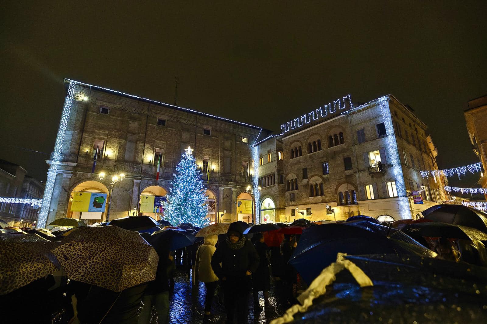 “La pioggia non ci ha impedito di essere tanti stasera, sotto i Portici e in Piazza, ad accendere il nostro albero di Natale. È stata una giornata cadenzata da appuntamenti di vera solidarietà, quella che fa la differenza, quella di cui abbiamo bisogno ogni giorno e che la luce di questo albero deve ispirare.”