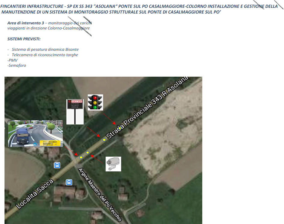 Verranno effettuate misure e rilevamenti del passaggio di mezzi pesanti con la pesatura dinamica Weight in Motion (”bisonte”), per mezzo di sensori installati sulle corsie con riconoscimento della targa, misure delle flessioni e possibili fessure sulle selle Gerber (tecnologia architettonica usata negli anni 50 – 70, ma che si rivela complessa da mantenere in salute nel tempo) e segnalazioni agli utenti della strada tramite pannelli a messaggi variabili e semafori.