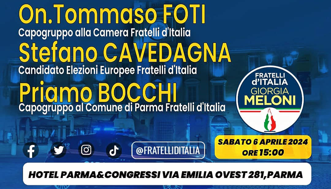 Interverranno il Capogruppo alla Camera dei Deputati On. Tommaso Foti, Stefano Cavedagna capogruppo Fdi Comune di Bologna e candidato nel collegio Nord est alle Elezioni Europee e Priamo Bocchi capogruppo Fdi del Comune di Parma.