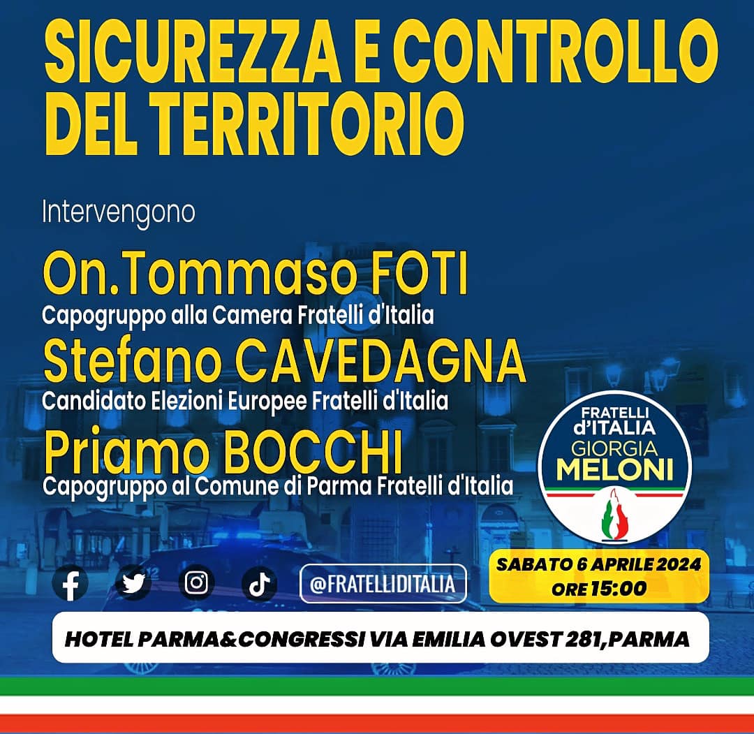Sabato 6 Aprile alle ore 15 presso l’Hotel Parma&Congressi Fratelli d’Italia organizzerà un convegno sul tema “Sicurezza e controllo del territorio”.