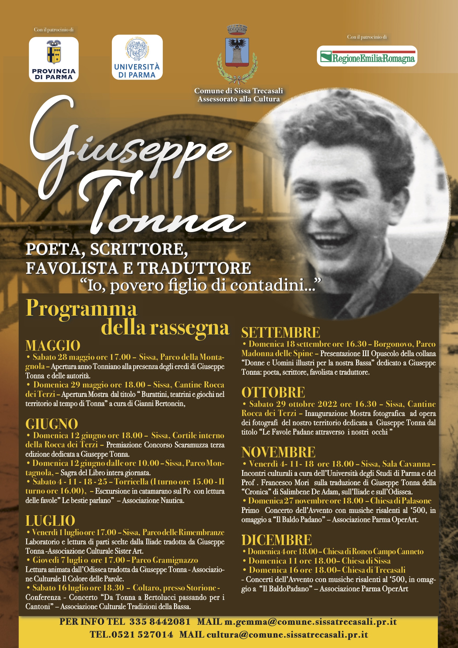 Il Comune di Sissa Trecasali dedica una rassegna di otto mesi, da maggio a dicembre con venti appuntamenti, ad uno dei suoi figli più illustri: Giuseppe Tonna: poeta, scrittore, favolista e traduttore.