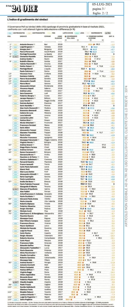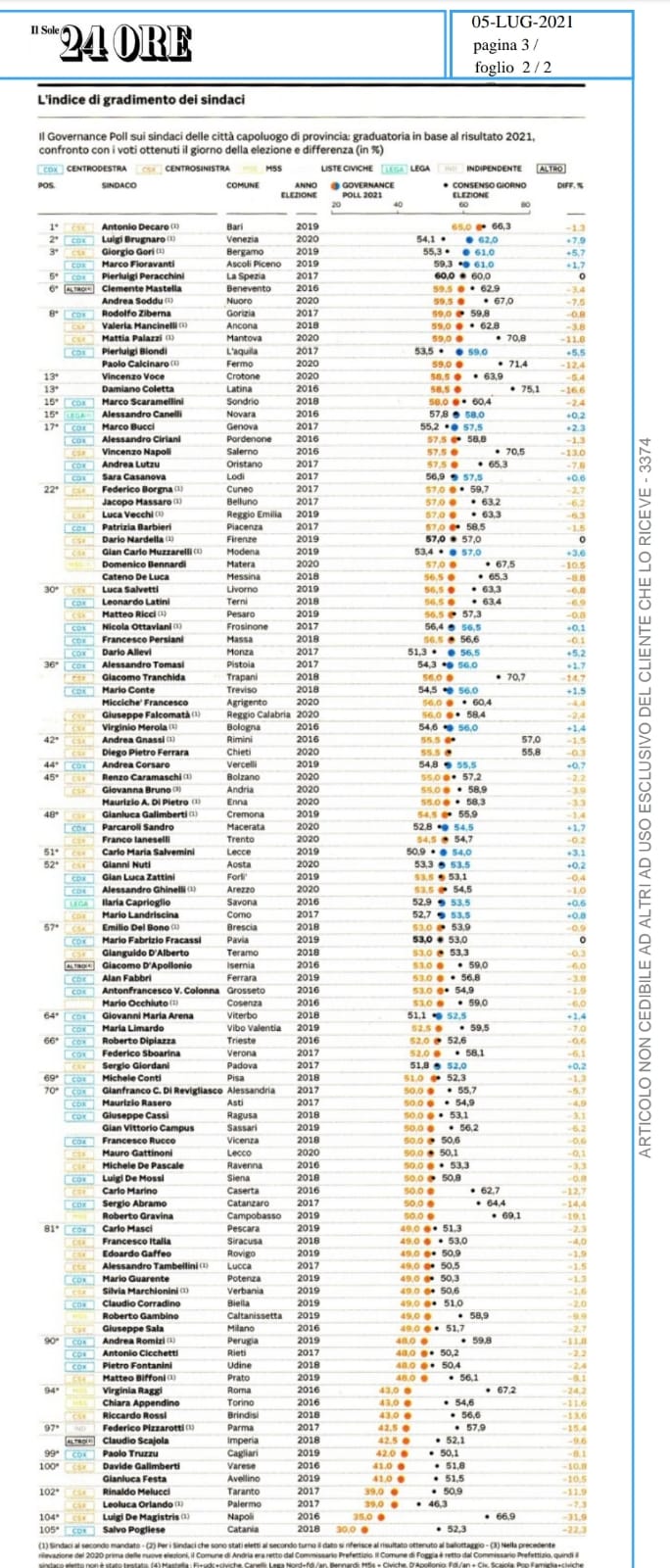 Sono usciti oggi i risultati del sondaggio del Sole 24 Ore che misura il consenso dei sindaci dei Comuni capoluogo.