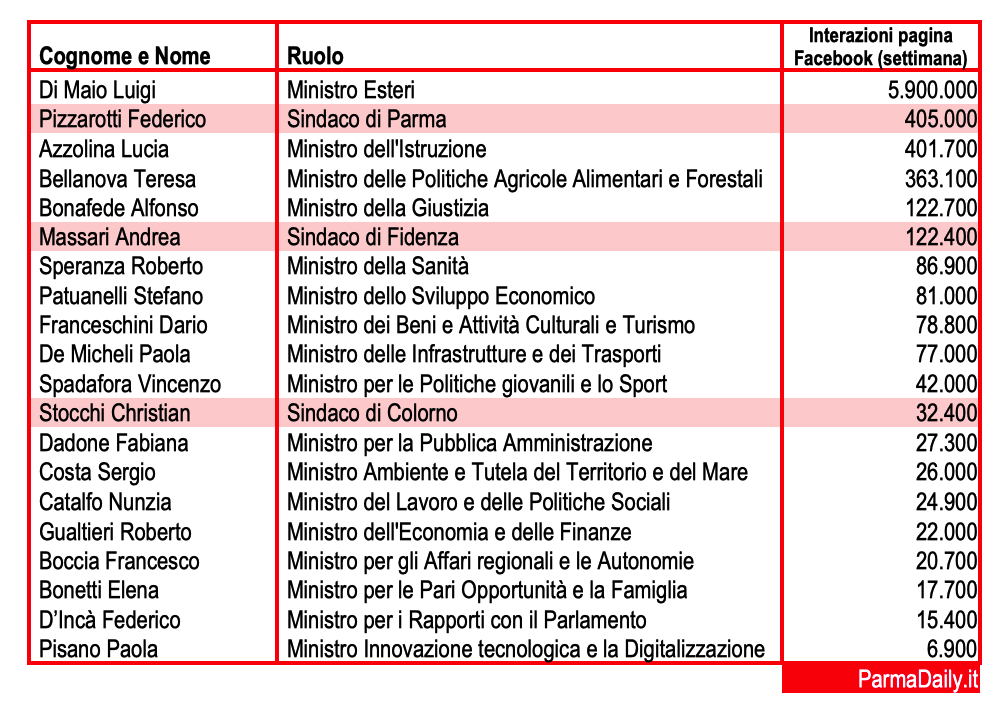 Il sindaco di Parma Federico Pizzarotti è più seguito di tutti i ministri, con l’eccezione di Di Maio (leader politico nazionale, prima ancora che ministro).