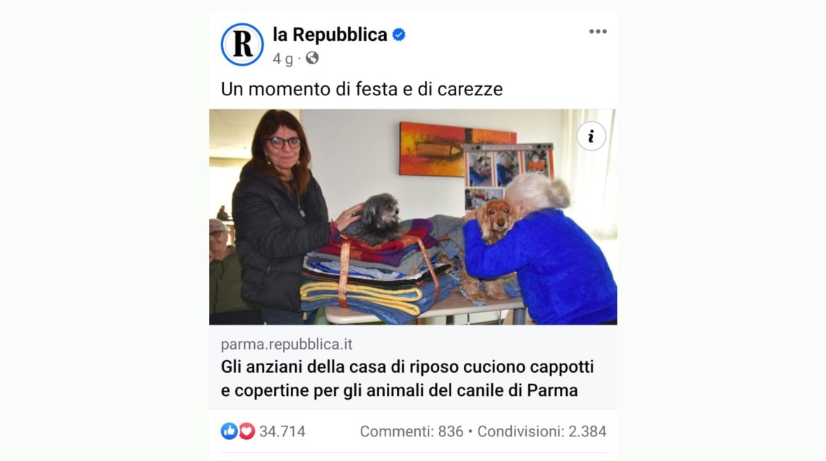 Ha letteralmente “spaccato” la notizia della donazione di coperte e giubbottini realizzati dagli anziani della RSA di Alberi per il canile municipale di Parma “Lilli e il Vagabondo” – leggi -.