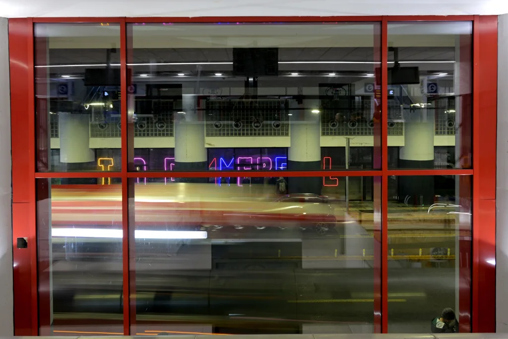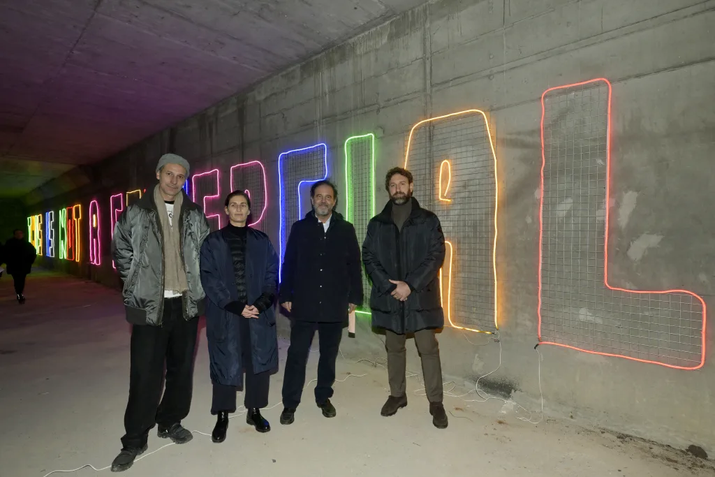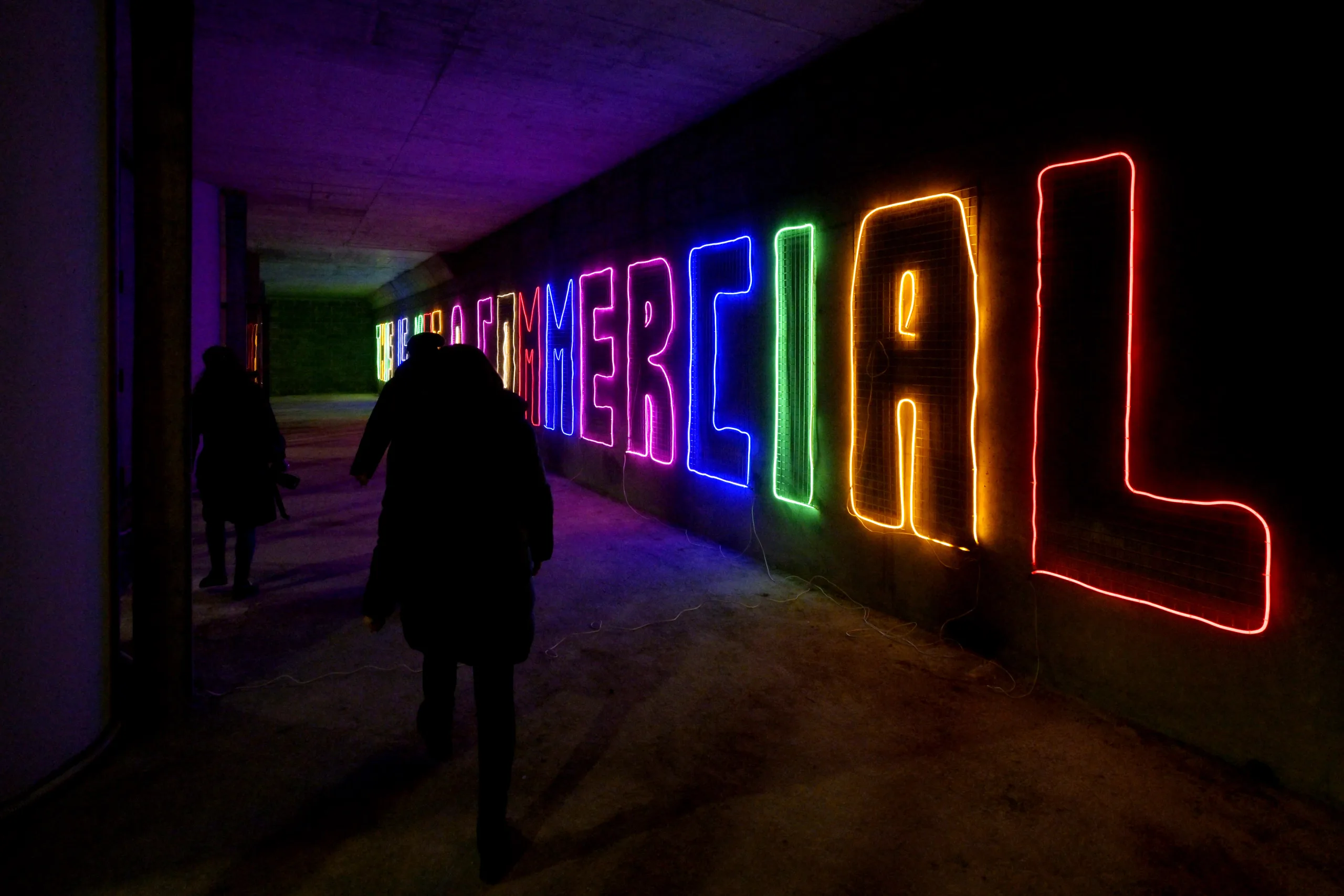 L’installazione luminosa “This is not commercial” del duo artistico sloveno-svizzero Veli & Amos è parte di una serie presentata in contesti internazionali, si trova nelle gallerie sotto il tunnel.