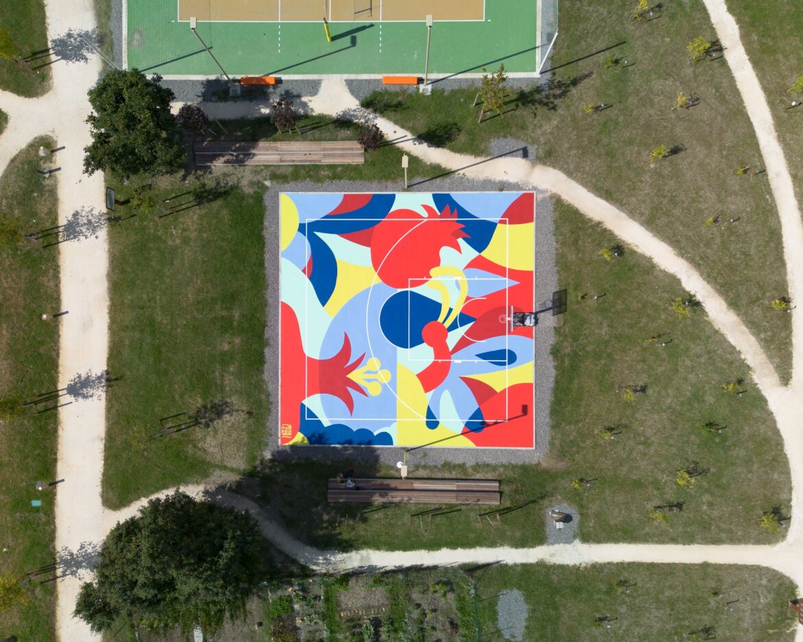 Una vibrante esplosione di colori accoglie ora chi entra al Parco dei Melograni: il campo da basket è diventato una vera e propria opera di street art grazie a Rise the Cat, giovane illustratore e artista emiliano, che ha saputo trasformare la superficie di gioco in una tela collettiva ricca di simboli, forme fluide e cromatismi brillanti.