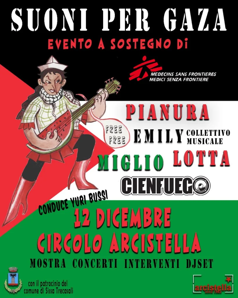 Trecasali (PR) – Una serata di musica, arte e testimonianze per sostenere l’intervento umanitario di Medici Senza Frontiere a Gaza: è l’iniziativa “Suoni per Gaza – Parma” in programma il 12 dicembre 2025 a Trecasali, presso il circolo Arci Stella di Piazza Eugenio Fontana 6. L’evento, che aprirà le porte al pubblico alle 20.00, nasce con l’obiettivo di raccogliere fondi da destinare interamente all’organizzazione medico-umanitaria, impegnata in prima linea nel garantire assistenza sanitaria in uno dei contesti più difficili del momento.