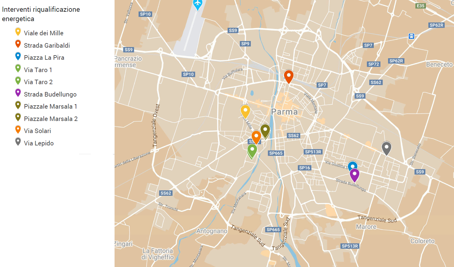 Gli immobili ricompresi nel Piano straordinario di riqualificazione energetica sono: Viale dei Mille 60-78 (1921); Strada Garibaldi 46 – Viale Bottego 2 (1953); Piazza La Pira 17,19,21 (1985); Via Taro 15,17,19 (1957); Via Taro 21,23,25 (1957); Via Nenni 33,35,37 – Strada Budellungo 14,16 (1982); Piazzale Marsala 3 (1906); Piazzale Marsala 5 (1906); Via Solari 17,19 (1925); Via Catullo 1 – Via Lepido 37,39 (1960).