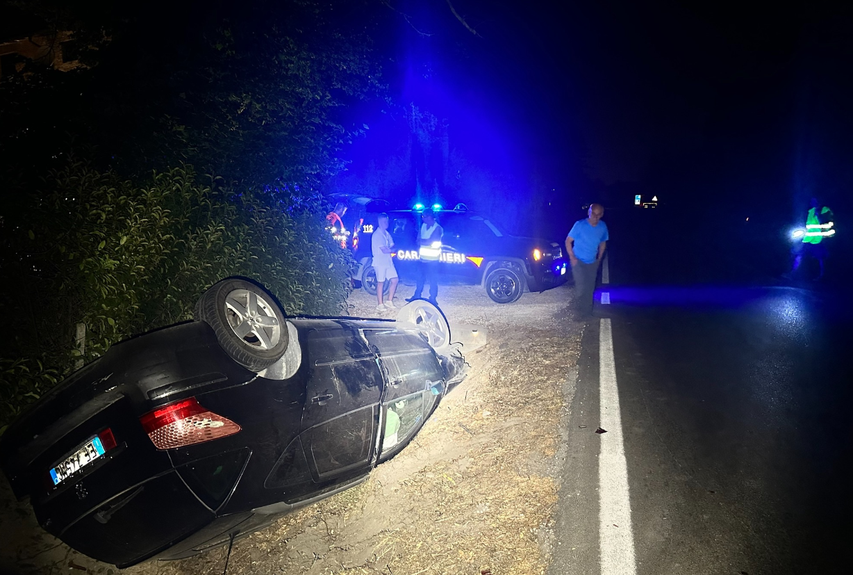 Purtroppo per lui il suo maldestro comportamento è durato solo circa un chilometro, perché probabilmente a causa forte velocità sostenuta per darsi alla fuga, ovviamente nel chiaro tentativo di non farsi identificare e di sottrarsi ad eventuali controlli da parte delle Forze di Polizia, perdeva il controllo della sua autovettura, fuoriusciva autonomamente dalla sede stradale, ribaltandosi a lato della strada nella corsia opposta.