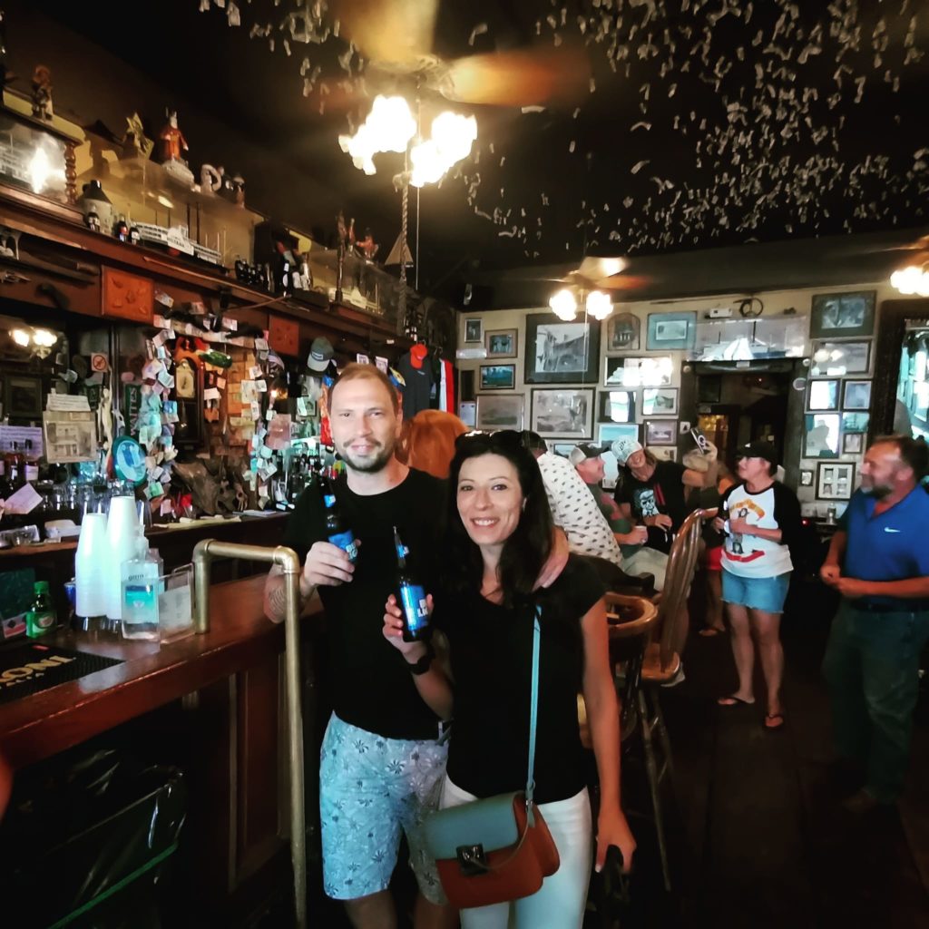 Al nostro ingresso qualcuno si volta, altri drincano alzando i calici. Prendo il cellulare per immortalare il momento quando, di fianco a me, un tizio si alza ma crolla a terra ubriaco portandosi con sé quindici bottiglie disordinatamente appoggiate al tavolo. La donna che è con lui se la ride, qualcuno prova a rialzarlo, tutti gli altri fanno finta di nulla come se da quelle parti fosse ordinaria amministrazione.