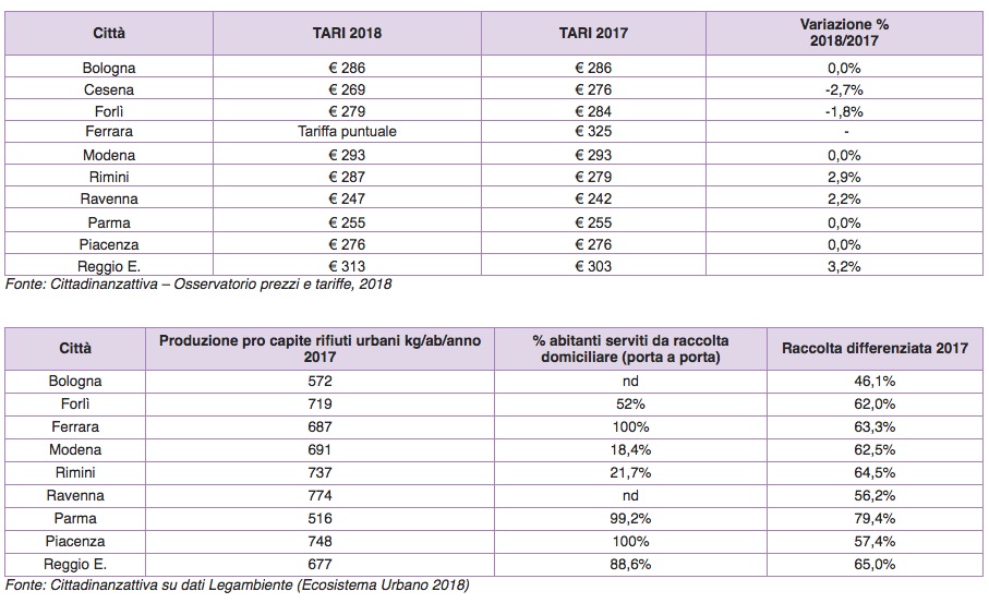 Rifiuti: 278 € la spesa media a famiglia in Emilia Romagna nel 2018, rispetto ai 302 € di media nazionale. A Parma la tariffa è 255 euro. I nuovi dati dell’Osservatorio Prezzi e Tariffe di Cittadinanzattiva.