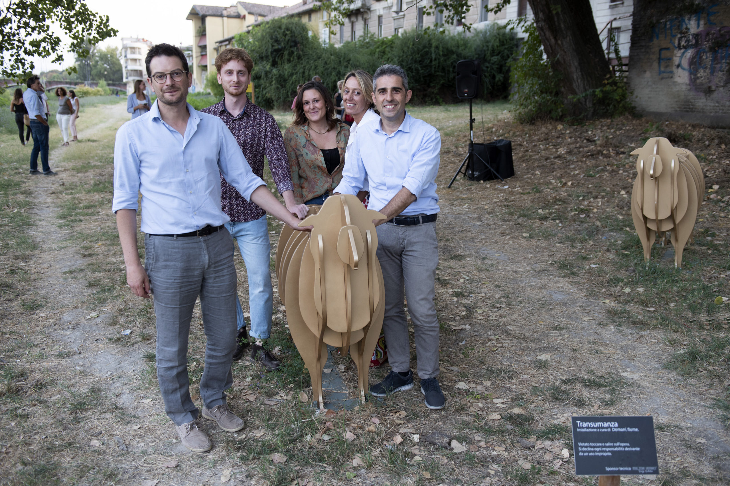È seguita l’inaugurazione di Transumanza – opera del Collettivo Domani – situata nel torrente Parma, all’altezza Ponte Verdi. L’opera “Transumanza” del collettivo Domani, fiume, composto da Beatrice Ciacchella e Andrea Lusignani, architetto e ingegnere, riassume in modo pratico il loro punto di vista sul tema della valorizzazione culturale e del paesaggio – frutto di un percorso condiviso tra architettura, grafica e land-art, lavorando per committenti privati e collaborando ad iniziative pubbliche volte alla valorizzazione fluviale. L’installazione nasce con l’intento di regalare persistenza ad un fenomeno tanto antico quanto fugace, che regolarmente avviene nel cuore della città di Parma: quello della transumanza. Cinque pecore d’oro realizzate nell’alveo del torrente ricorderanno la ricchezza di questa attività, proclamata Patrimonio Culturale Immateriale dell’Umanità, fornendo inoltre un pretesto per guardare la città da una prospettiva diversa.