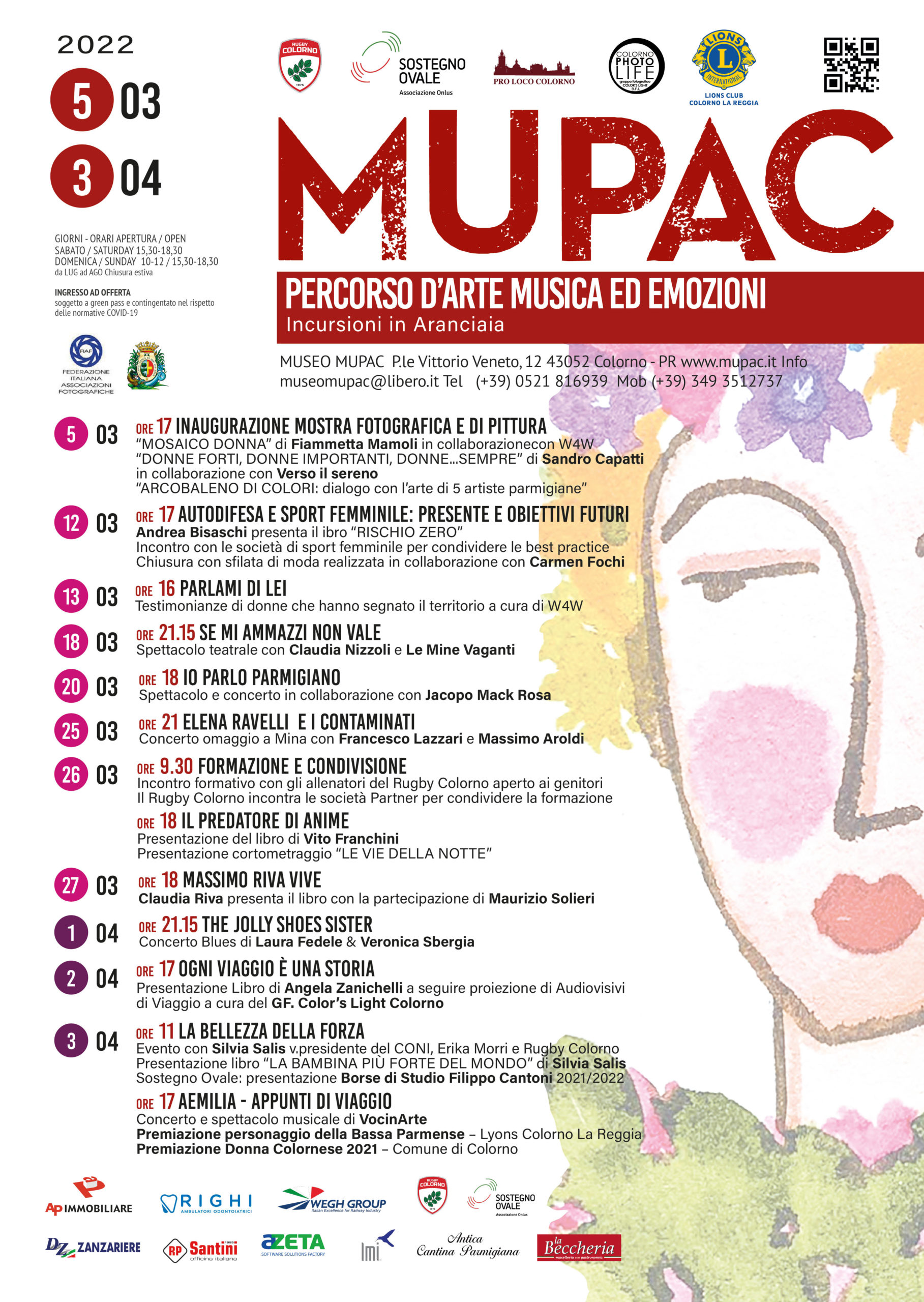 Dopo il successo dei primi due weekend, prosegue la rassegna “Percorso d’arte musica ed emozioni. Incursioni in Aranciaia” al Museo MUPAC di Colorno. Una kermesse di eventi nei quali l’universo femminile è raccontato con passione attraverso l’arte, la musica, il cinema, la letteratura e lo sport da chi mette la donna al centro, ogni giorno.