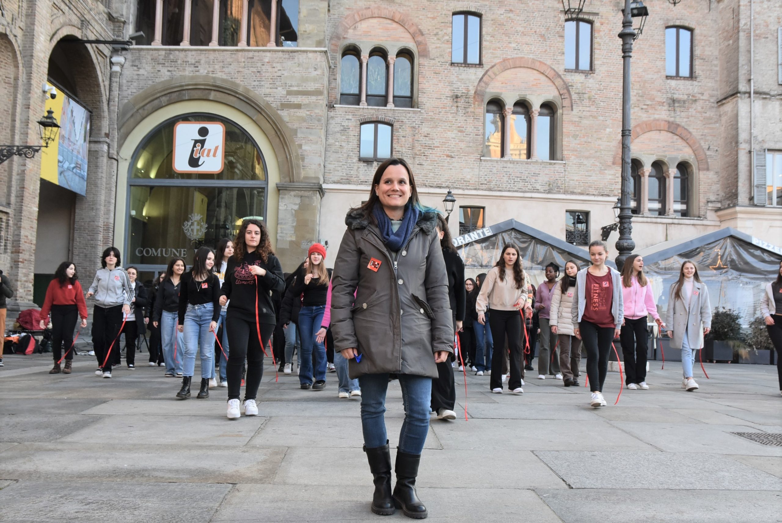 Nastri rossi, una coreografia coordinata, ma anche biglietti con messaggi in altre lingue perchè in piazza hanno ballato per la libertà e il rispetto delle donne tantissime studentesse delle classi del Liceo Linguistico G. Marconi accompagnate dalle professoresse Rosanna Allegri, Barbara Cresci e Paola Ugolotti.