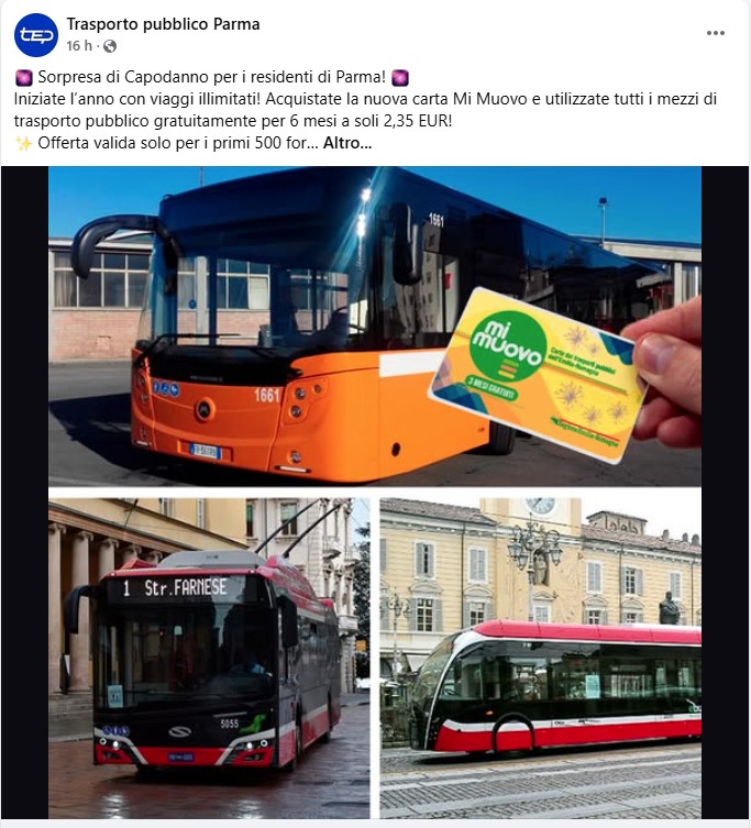 La pagina in questione, attualmente denominata “Trasporto pubblico Parma”, promette card Mi Muovo a prezzi estremamente ridotti, ma si tratta di un’iniziativa fraudolenta.