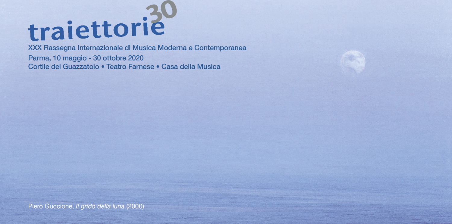 Nata all’alba dell’ultimo decennio del Novecento con un memorabile concerto dedicato a Luigi Nono, «Traiettorie» ha saputo conquistare nel tempo un proprio pubblico, ampliandolo sempre di più e contribuendo in maniera significativa ad avvicinare molti ascoltatori alla musica contemporanea, di cui ha nei fatti colmato l’assenza nella vita musicale di Parma fino a quel momento. Grazie all’interazione con il tessuto culturale cittadino ha poi dialogato in molte occasioni su più fronti, rivelando quella predisposizione al colloquio con le arti che del resto è già evidente dalla scelta di affidare la realizzazione dell’immagine di ogni edizione a un artista figurativo differente, fra cui si contano nomi come Schifano, Vedova, Bendini, Clemente, Lumaca e Gianquinto. Predisposizione che si conferma anche quest’anno con la scelta dell’opera pittorica «Il grido della luna» (2000) dell’artista siciliano Piero Guccione.