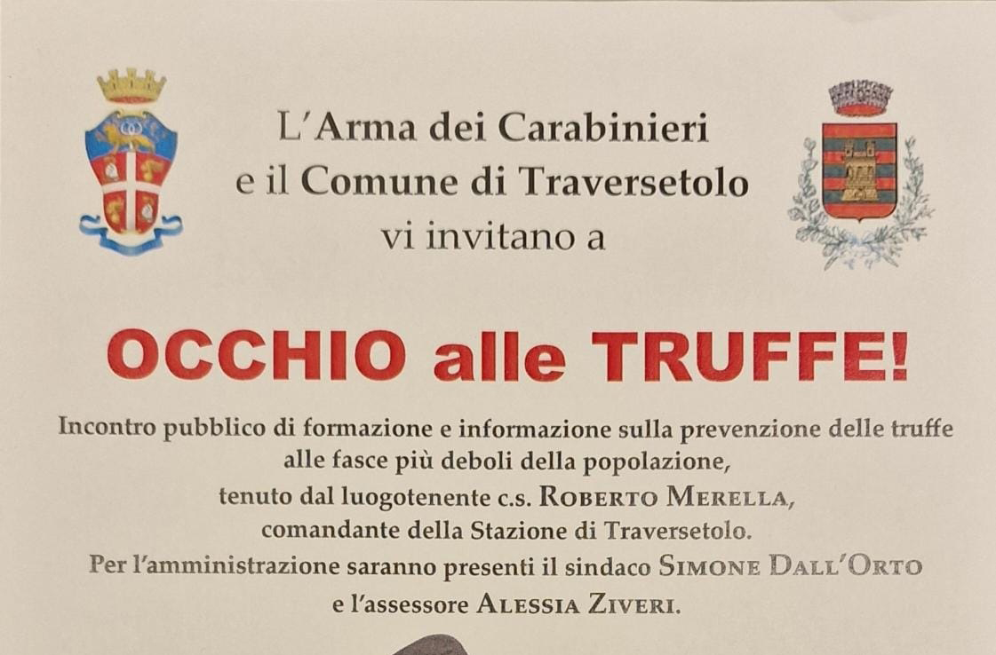 Domani sera alle ore 21, presso la Sala Consiglio del Centro Corte Agresti di Traversetolo, riprendono le conferenze per la campagna di sensibilizzazione contro le truffe avviata dal Comando Provinciale dei Carabinieri di Parma in tutto il territorio della Provincia.