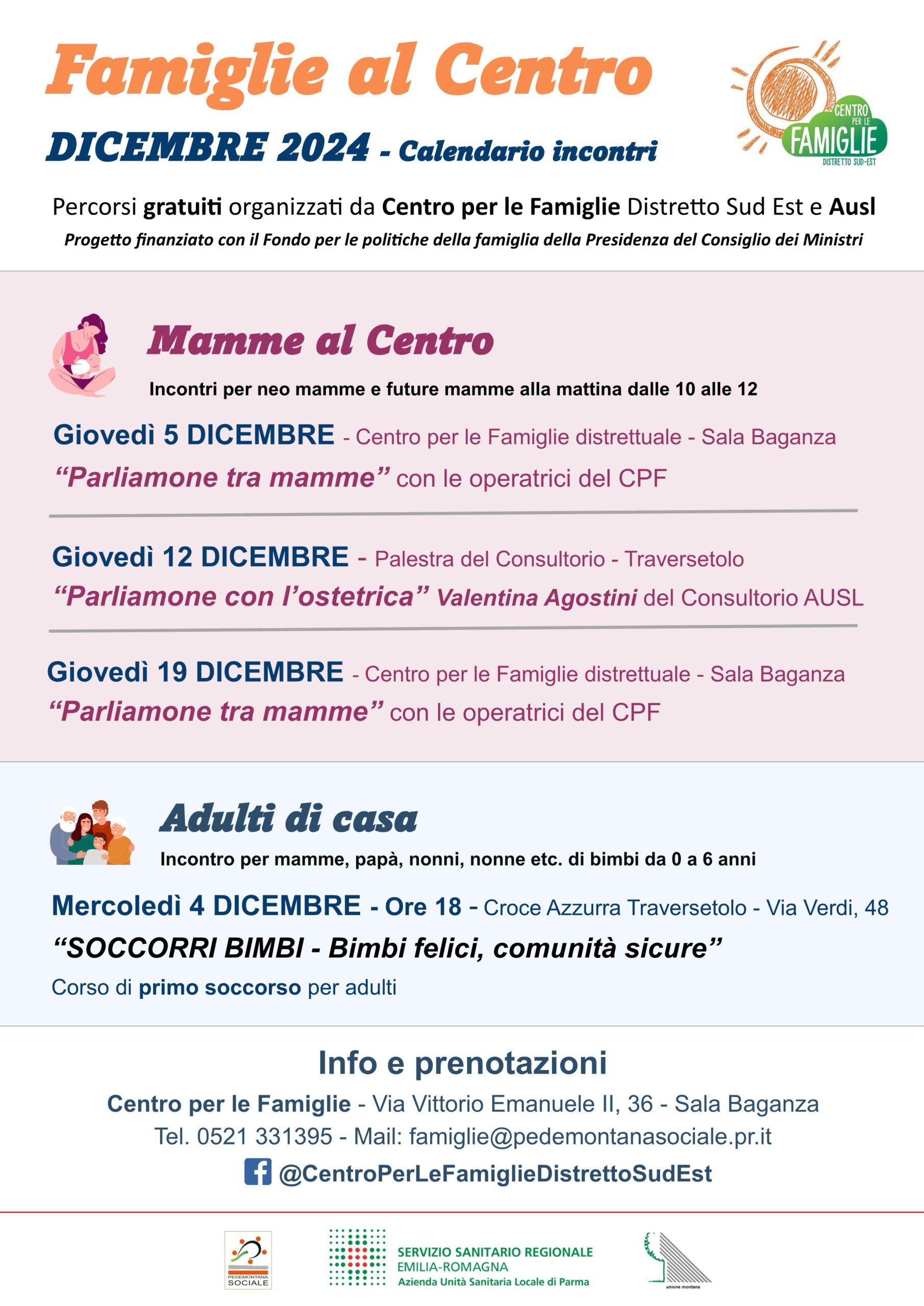 Anche per il mese di dicembre, il Centro per le Famiglie distrettuale ha organizzato, in collaborazione con l’Ausl e la Croce Azzurra di Traversetolo, una serie di quattro incontri gratuiti con esperti nell’ambito del progetto “Famiglie al Centro”, per vivere al meglio la genitorialità attraverso momenti di incontro e confronto.  E tra questi, ci sarà anche un corso di primo soccorso