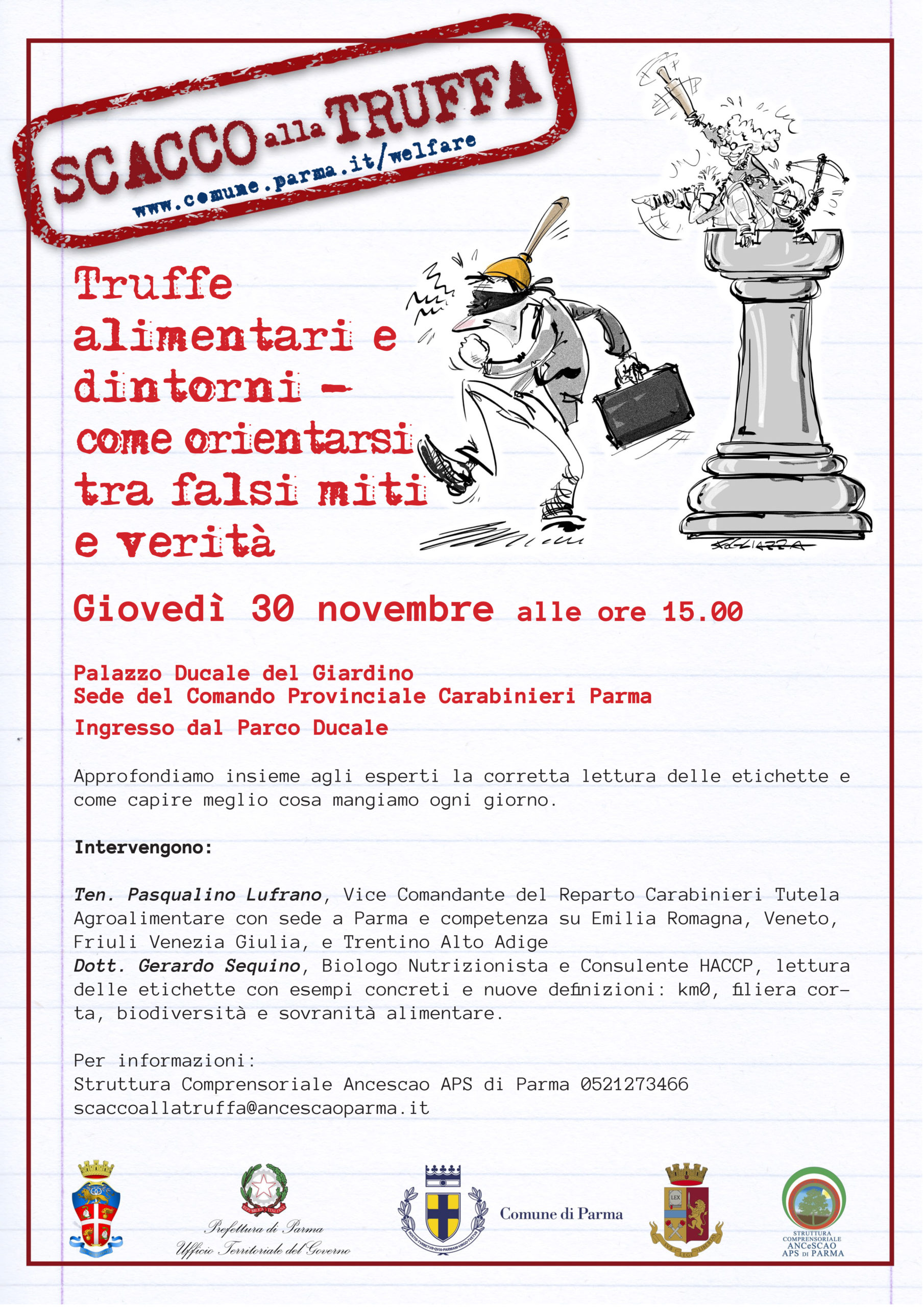 L’incontro fa parte della campagna di comunicazione “Scacco Alla Truffa”, realizzata da Ancescao APS Parma e Comune di Parma in collaborazione con Prefettura di Parma, Carabinieri di Parma e Ministero dell’Interno, con il contributo del disegnatore parmigiano Gianluca Foglia in arte Fogliazza.