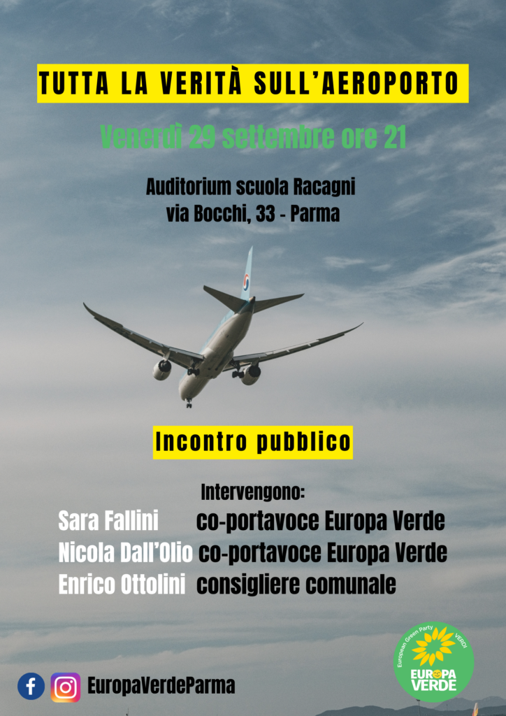 Europa Verde organizza venerdì 29 settembre alle ore 21, all’Auditorium della scuola Racagni, in via Bocchi 33, l’incontro pubblico “Tutta la verità sull’aeroporto”.