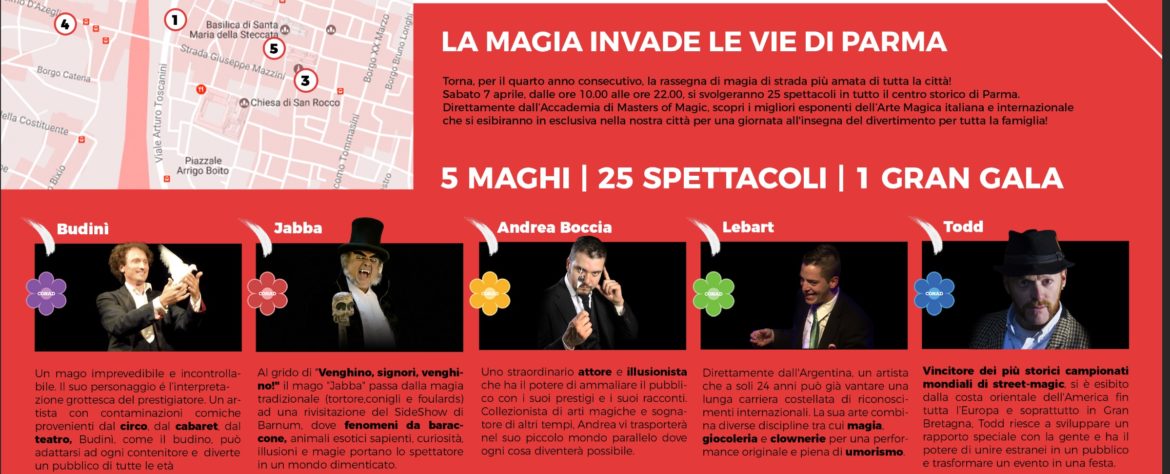 Sabato 7 aprile, direttamente dall’accademia di Masters of Magic, i migliori esponenti dell’Arte Magica Italiana e internazionale in esclusiva nella nostra città per stupire con le loro performance e per far vivere il centro storico, dai parmigiani, dai commercianti e dagli ospiti presenti in città, in modo del tutto nuovo. Per un’intera giornata grandi e bambini verranno coinvolti e trascinati in un mondo magico.