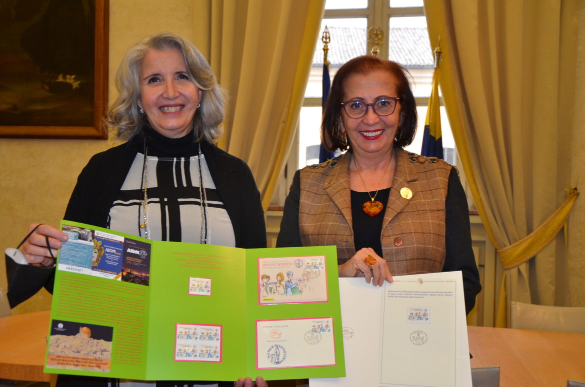 La dottoressa Antonella Vezzani, Presidente Nazionale delle donne medico, ha consegnato, questa mattina, in municipio, all’assessora Nicoletta Paci, con delega alla Politiche per la Sanità, il Francobollo del centenario AIDM.