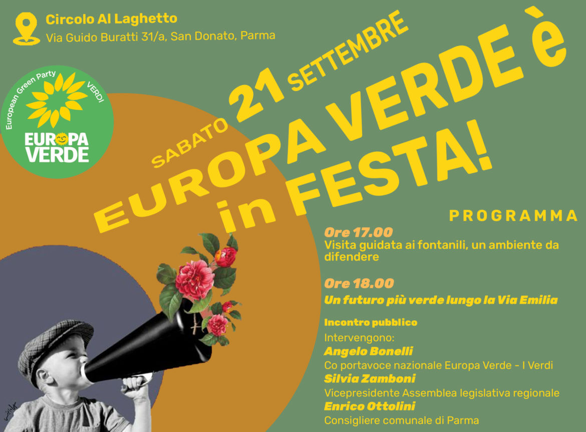 Prima dell’incontro pubblico, il programma della Festa prevede alle ore 17.00 una visita guidata a piedi ai vicini fontanili con partenza dal circolo Il Laghetto. Dalle 19.30 aperitivo e cena e a seguire musica con Soul in due, tra classici italiani, pop contemporaneo e black music. Per aperitivo e cena è richiesta la prenotazione scrivendo a europaverdeparma@gmail.com