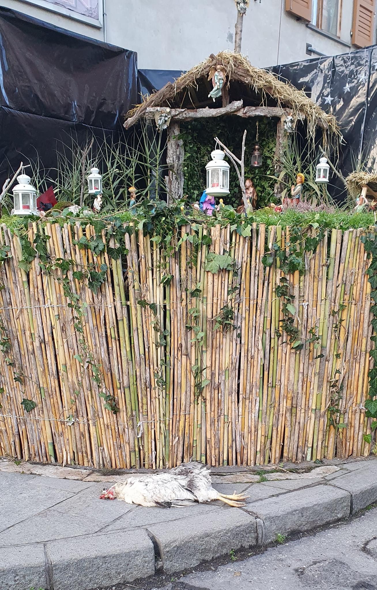 Rimane il fatto che qualcuno ha ucciso un gallo e lo ha deposto ai piedi del presepe. Lo si vede bene in nella foto di sotto postata su facebook da Ugo Ugolotti.