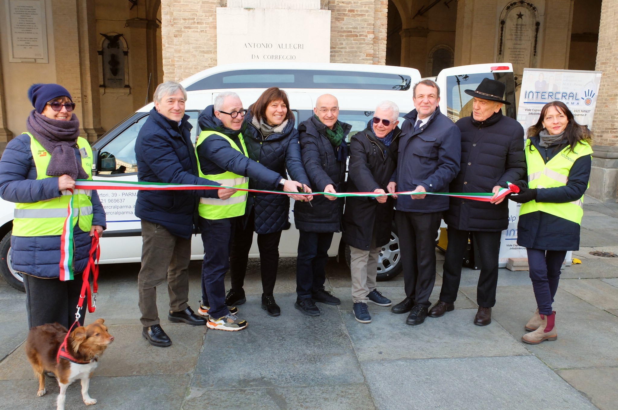 È stato presentato questa mattina, in piazza Garibaldi, il nuovo veicolo per trasporto disabili di Intercral Parma, acquistato grazie a un contributo di Fondazione Cariparma.