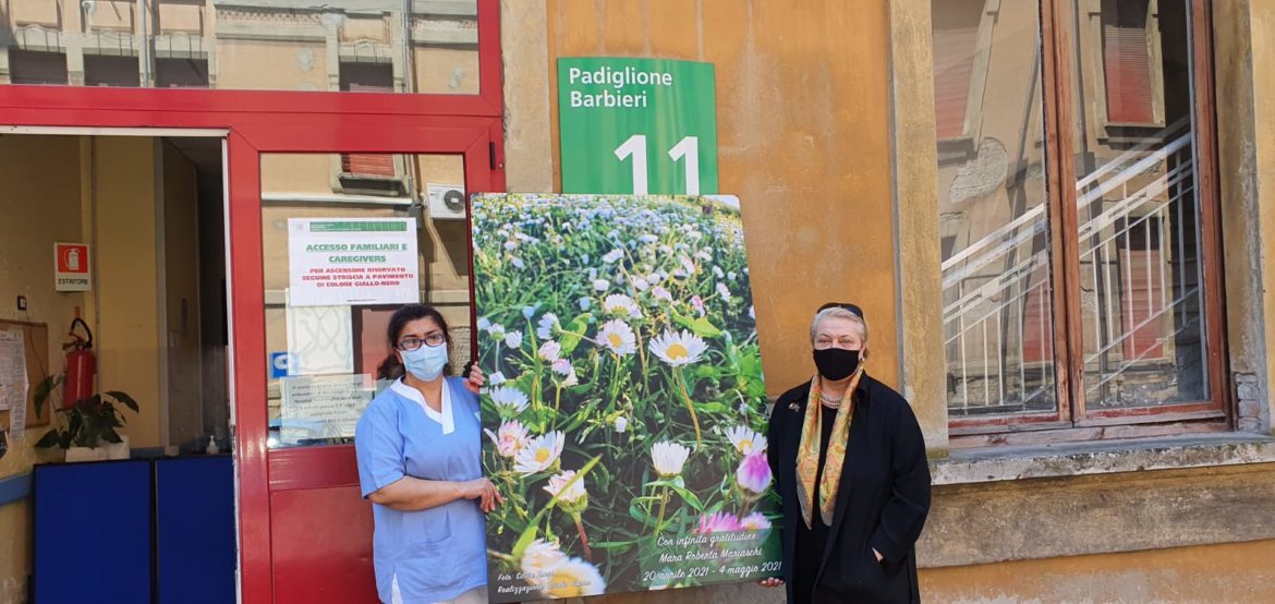 Dire grazie con un’immagine; è questa la scelta che ha fatto Mara Mariaschi per ringraziare gli operatori del Covid hospital. L’immagine con fiori colorati è la stessa che Mara ha scelto per aiutarsi durante i giorni di ricovero a concentrarsi sulla respirazione e che ora decora le pareti del Covid hospital.