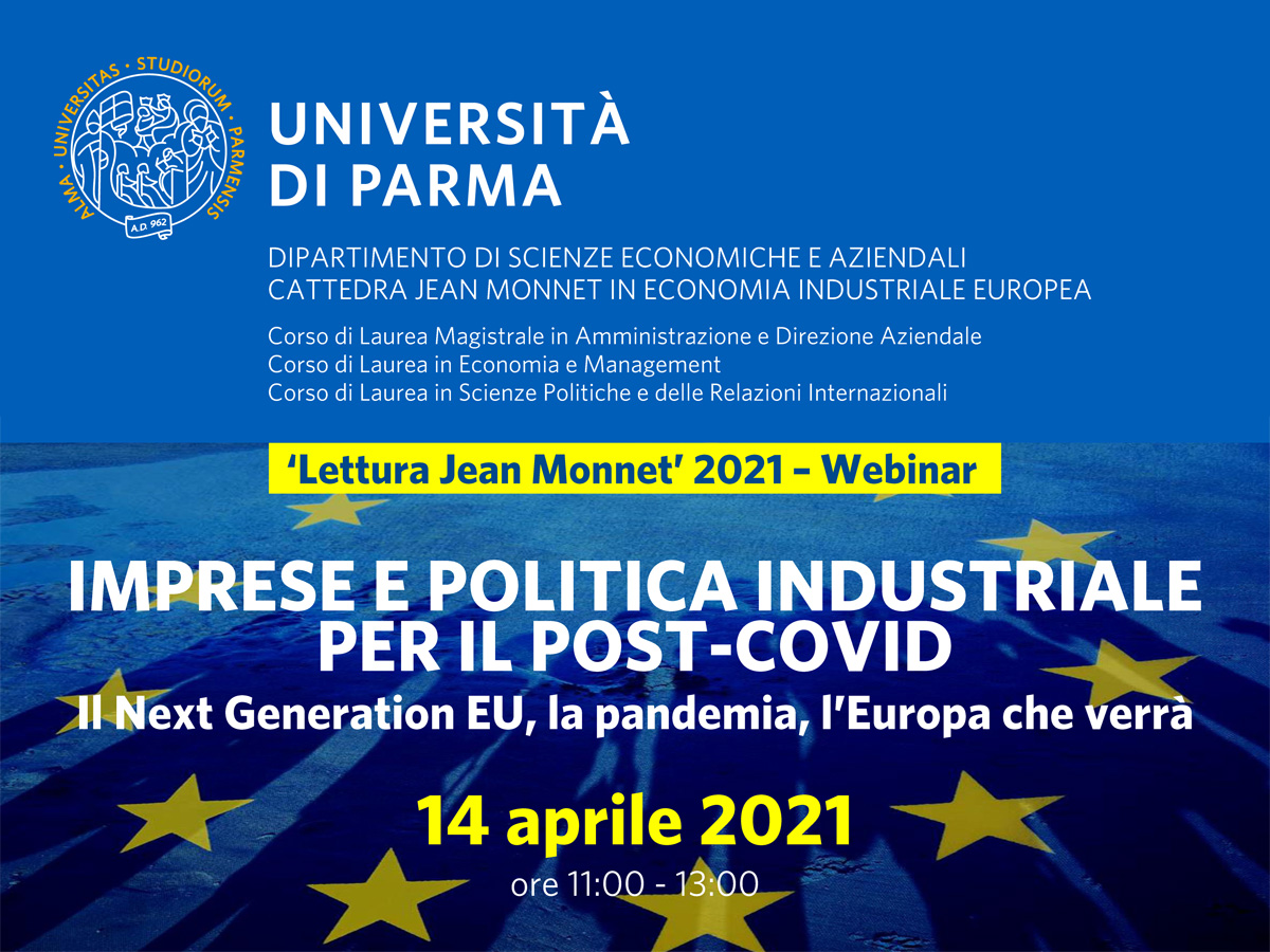 Imprese e politica industriale per il post-COVID è il tema della “Lettura Jean Monnet 2021” che si terrà in modalità webinar all’Università di Parma mercoledì 14 aprile dalle 11 alle 13. Sarà possibile seguire l’incontro in diretta streaming collegandosi al sito web di Ateneo www.unipr.it