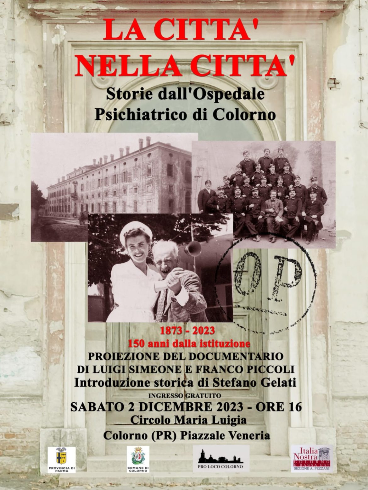 Sabato 2 dicembre 2023 alle ore 16, presso il Circolo Maria Luigia di Colorno, Piazzale Veneria, ci sarà la proiezionre di un documentario di Luigi Simeone e Franco Piccoli dal titolo “UNA CITTA’ NELLA CITTA’” Storie dall’Ospedale psichiatrico di Colorno, con l’introduzione storica di Stefano Gelati.