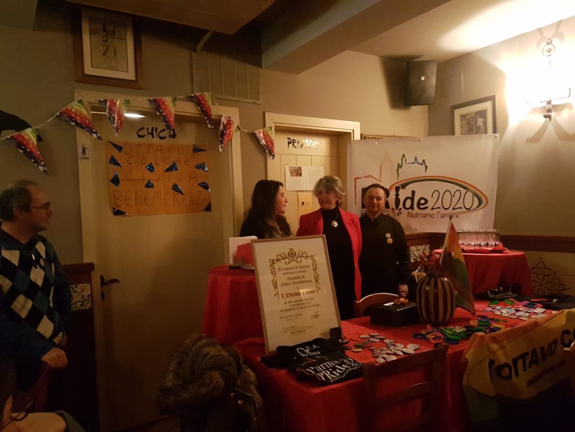 In seguito è intervenuta Valeria Savazzi, fondatrice ed anima dell’Associazione premiata, la quale , nonostante l’evidente commozione, ha ribadito l’impegno dell’Ottavo Colore ed in particolare modo quello a favore del Pride Parma 2020 che si celebrerà il prossimo 13 giugno.