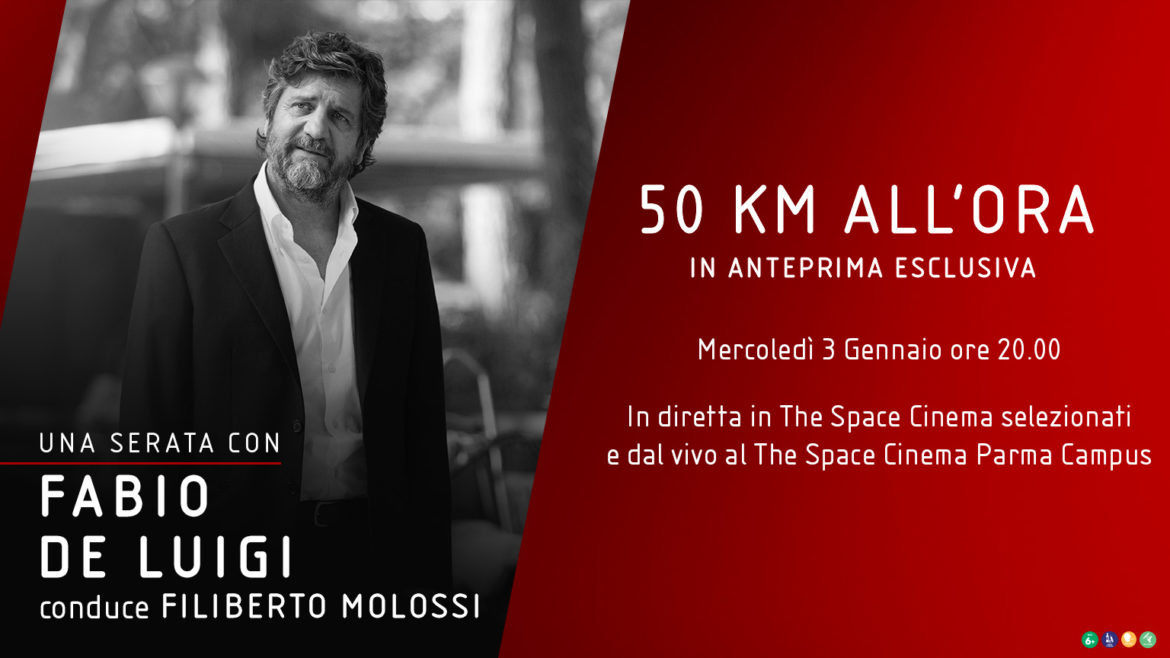S’intitola “50 km all’ora” ed è il nuovo film interpretato e diretto da Fabio De Luigi, che lo presenterà in anteprima durante l’evento dal vivo “Una Serata Con…”, organizzato da The Space Cinema presso il multisala di Parma – Campus. L’appuntamento è fissato per mercoledì 3 gennaio alle ore 20, con la moderazione del giornalista Filiberto Molossi.