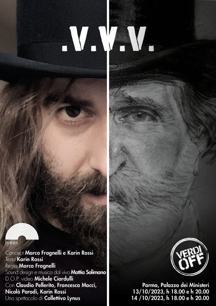 La vita di Giuseppe Verdi diventa il soggetto di una nuova serie tv in V.V.V., lo spettacolo del Collettivo Lynus in scena a Verdi Off venerdì 13 e sabato 14 ottobre 2023, ore 18.00 e ore 20.00, a Palazzo dei Ministeri, ideato da Marco Fragnelli e Karin Rossi, che firmano rispettivamente regia e testi, con il sound design e la musica dal vivo di Mattia Solimano e il video design di Michele Ciardulli, interpretato da Claudio Pellerito, Francesca Macci, Nicolò Parodi, Karin Rossi.