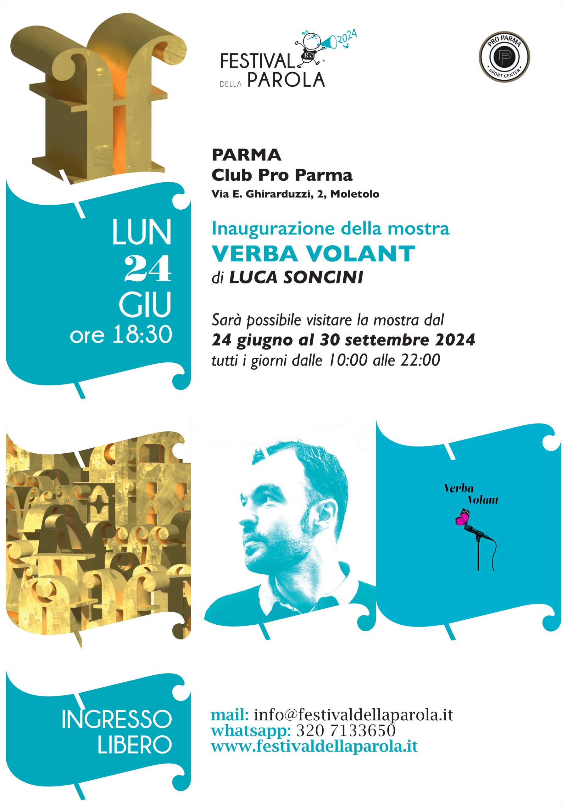 L’inaugurazione della mostra, come sempre realizzata con il supporto tecnico di Servizievole, è in calendario per lunedì 24 giugno, alle ore 18.30, alla presenza dell’autore e del curatore del FdP, Manlio Maggio, di Ombretta Sarassi Binacchi (General manager di OPEM Spa, main sponsor della manifestazione e della mostra), oltre che di Vanessa Vollaro e Stefano Morrone, in rappresentanza del Club Pro Parma.