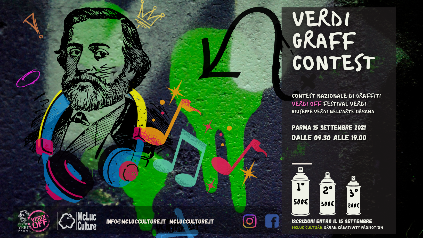 Il contest è aperto alle/ai writers residenti in Italia dai 16 anni in su. Il montepremi è di 1000€ suddiviso in primo, secondo e terzo posto. Verdi Graff Contest è ospitato dal Verdi Off Festival con il sostegno del Teatro Regio e si svolgerà il 18 Settembre a Parma dalle 09:30 alle 19:00.
