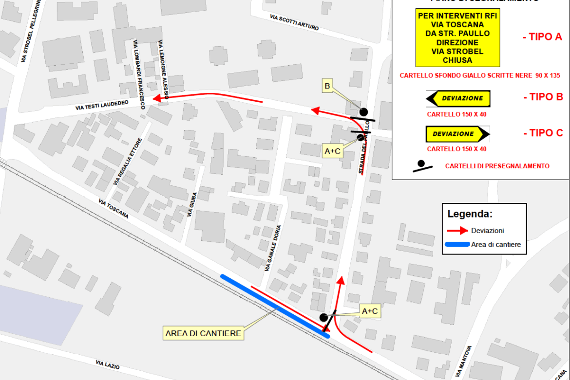 I veicoli che normalmente percorrono via Toscana direzione via Strobel/via Tanara verranno deviati sul seguente percorso: via Toscana, Strada Del Paullo, via Testi e via Strobel.