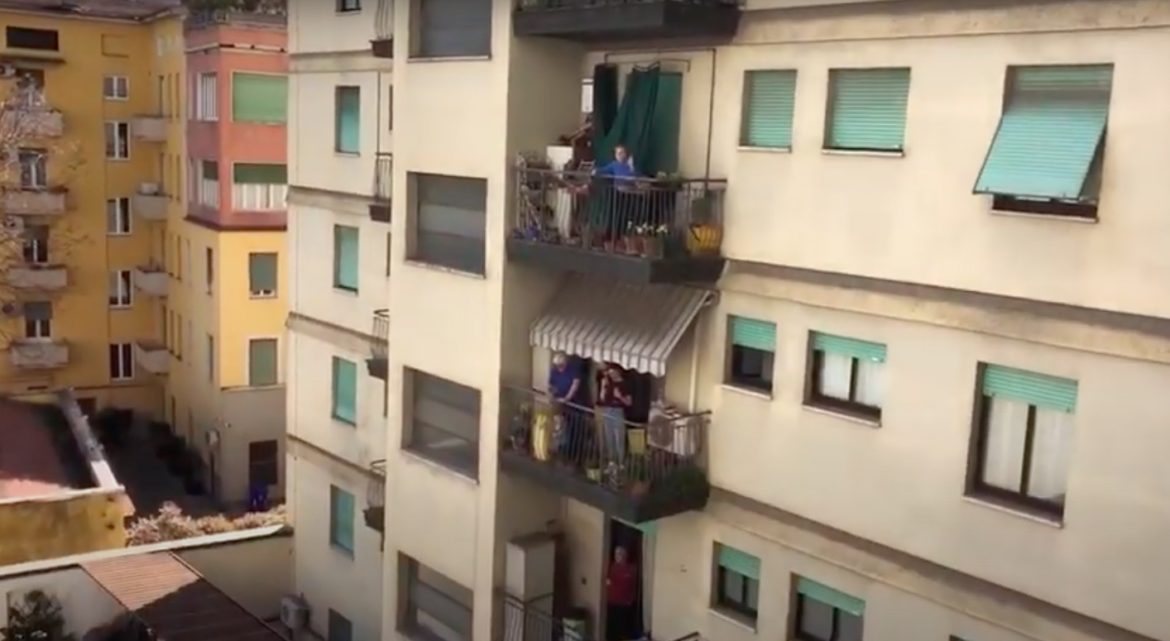 Così chi aveva più tempo ed energia ha accresciuto le file dinanzi ai tabaccai, le farmacie, le edicole e soprattutto quelle più lunghe dinanzi ai supermercati. Il giorno di Pasqua a mezzogiorno, tutte le 48 famiglie sono state invitate ad affacciarsi ai propri balconi per rivolgersi un augurio di serenità e benessere. L’iniziativa è stata gradita da tutti perché è stata l’occasione per molti di essere e sentirsi meno soli e meno isolati. Dai balconi si sono levati auguri, incoraggiamenti e parole di speranza e per un attimo grazie a questo brindisi allargato ci si è dimenticati della ” clausura forzata”. Già nelle settimane precedenti il cortile, che solitamente viene utilizzato per dar sfogo ai bambini, era diventata la lavagna su cui campeggiava la scritta a chiare lettere ” Auguri”.