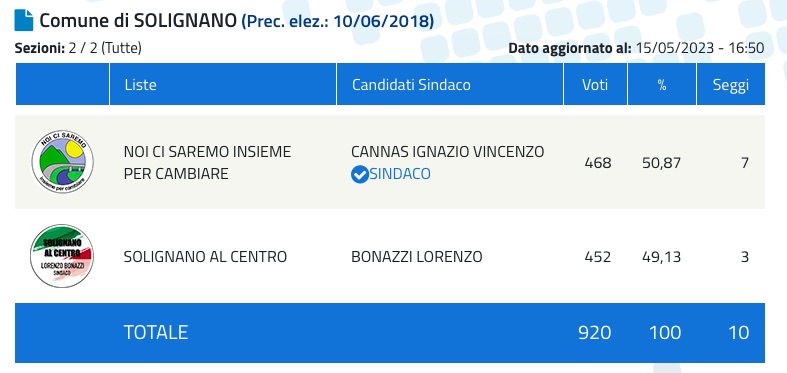 Ignazio Vincenzo Cannas (sostenuto dal centrosinistra) è il nuovo sindaco di Solignano: ha superato di 16 voti il sindaco uscente Lorenzo Bonazzi.