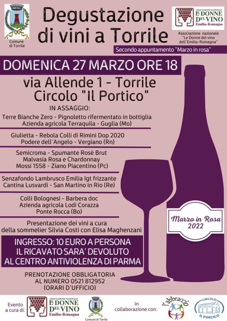 L’iniziativa sarò ripetuta, con la degustazione di altri vini emiliano-romagnoli, domenica 27 marzo alle 18, sempre al circolo Il Portico di via Allende 1 a Torrile. Ingresso 10 euro a persona con prenotazione obbligatoria al numero 0521 812952 (in orario d’ufficio). L’incasso sarà nuovamente devoluto al Centro antiviolenza di Parma. In assaggio pignoletto, rebola, spumante, lambrusco e barbera con presentazione dei vini a cura della sommelier Silvia Costi e di Elisa Maghenzani.