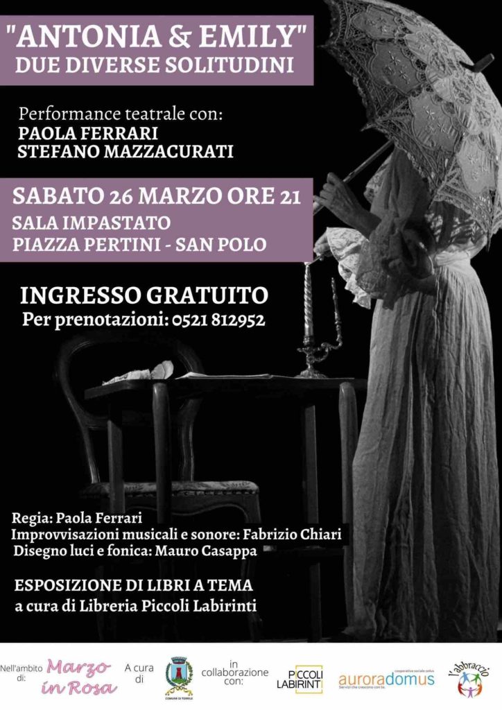 Sabato 26 marzo alle 21 (ingresso gratuito) sarà proposto lo spettacolo “Antonia & Emily: due diverse solitudini”, omaggio a due icone della poesia femminile come Antonia Pozzi ed Emily Dickinson per riflettere su come la solitudine, la sensibilità, la contemplazione della bellezza e della natura, la malinconia e perfino il dolore siano preludio ad alcune delle più alte espressioni artistiche. Sul palco l’attrice Paola Ferrari e, al suo fianco, lo psichiatra e scrittore Stefano Mazzacurati. Durante l’evento esposizione di libri a tema a cura della Libreria Piccoli Labirinti.