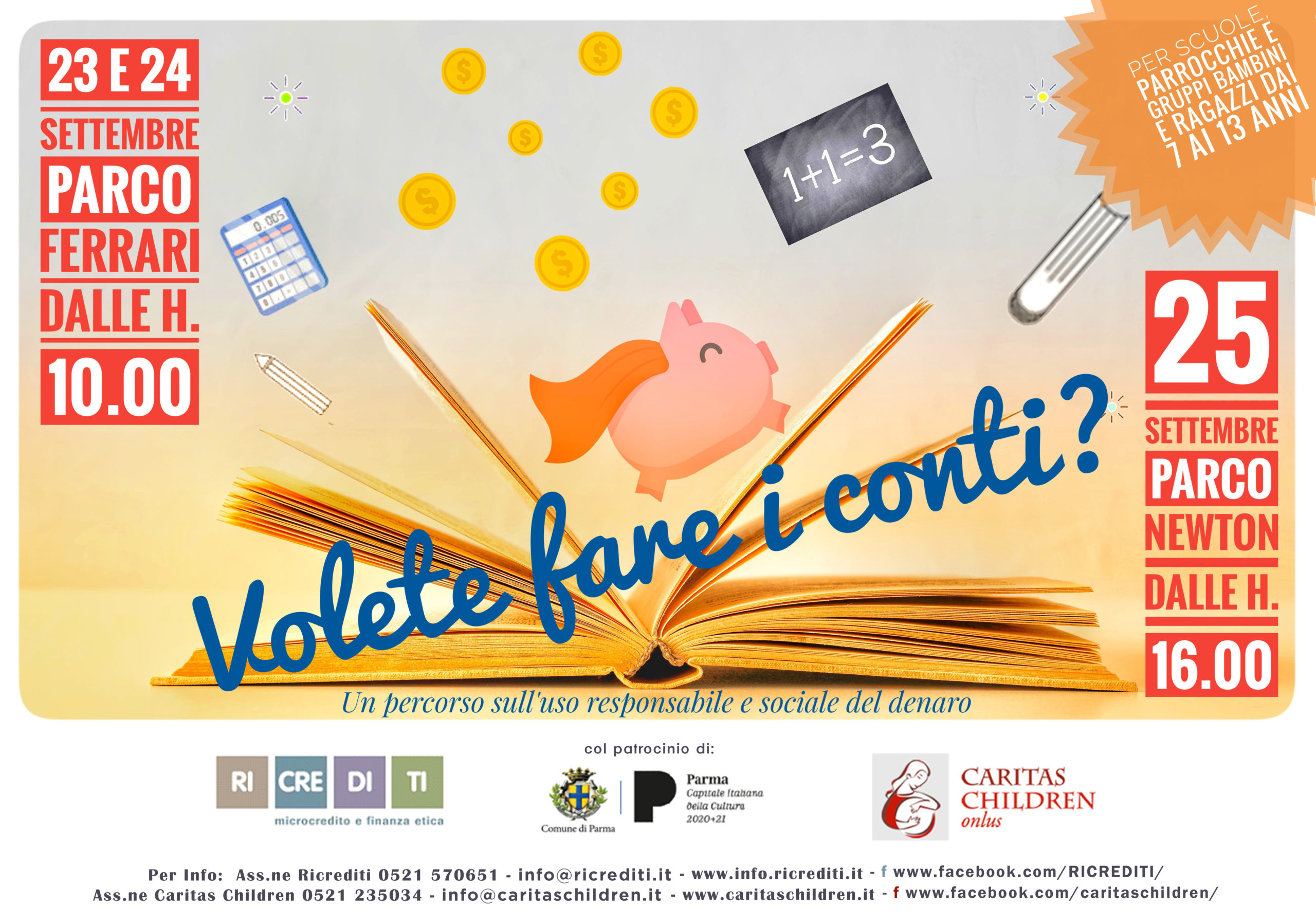 “Volete fare i contri?” è un percorso pensato dall’Aps Ricrediti in partenariato con Caritas Children e patrocinato dall’Assessorato alla Partecipazione del Comune di Parma grazie al bando “Volontariamente”, allo scopo di trasferire, attraverso attività ludiche, ai ragazzi di età compresa tra i 7 e i 13 anni, l’importanza della gestione consapevole delle proprie risorse, della pianificazione nell’utilizzo delle stesse e della responsabilità individuale ma anche sociale che questo comporta.