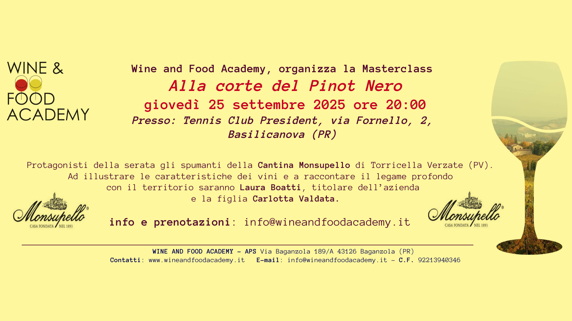 La Wine and Food Academy, nell’ambito delle sue iniziative enogastronomiche organizza per giovedì 25 settembre 2025, nei locali del “Tennis Club President, in via Fornello, 2 a Basilicanova una masterclass per celebrare insieme l’eccellenza del Pinot Nero in un’atmosfera di amicizia, cultura e gusto.