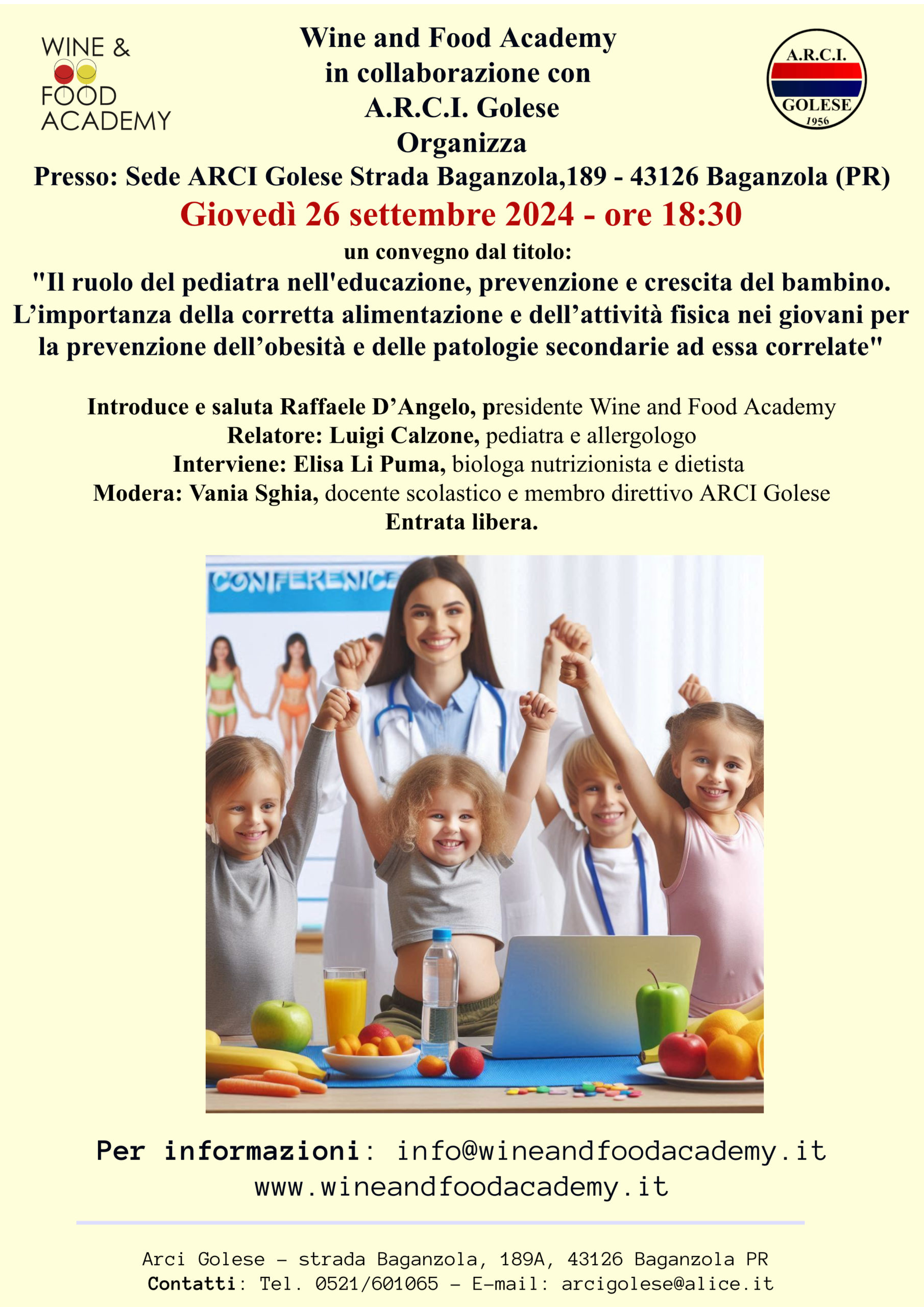 - 26 settembre 2024: “Il ruolo del pediatra nell’educazione alimentare del bambino”, un incontro dedicato alla prevenzione dell’obesità infantile, in collaborazione con il Circolo ARCI Golese.
